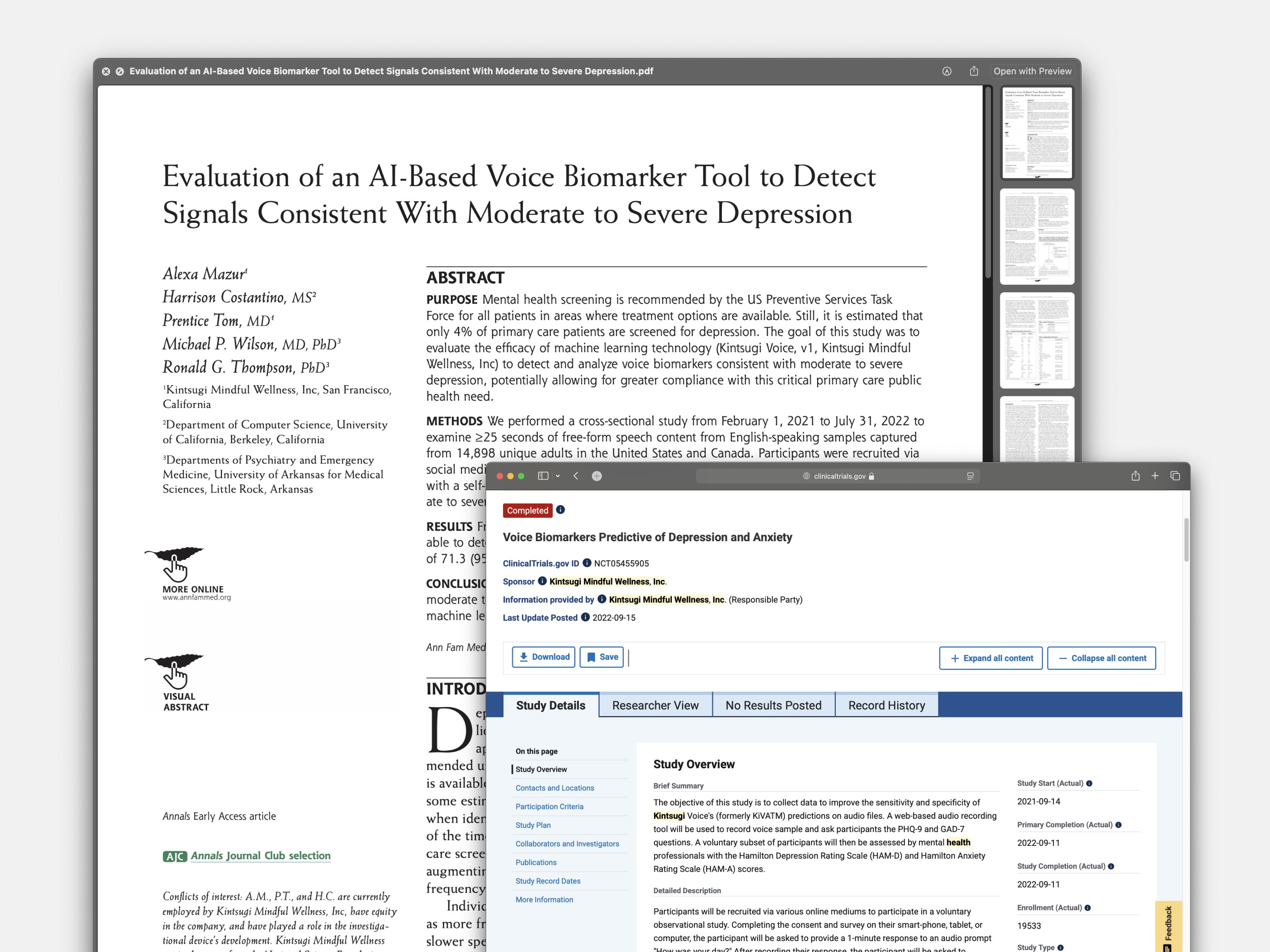 Kintsugi is developing novel voice biomarker infrastructure to score clinical depression and anxiety from 20-seconds of free form speech. My role involved establishing data acquisition strategies contributing to the world's largest voice dataset annotated for mental health foundation models, leading the vetting and outreach process to 100+ clinical trial recruitment companies and cross-promotional partners. Project details under NDA